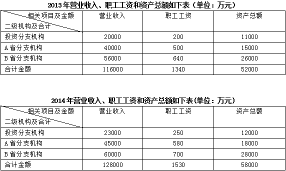 3.某保險公司總機構(gòu)設(shè)在我國某大城市,除在該大城市設(shè)立具有獨立經(jīng)營職能的投資分支機構(gòu)(該投資分支機構(gòu)的經(jīng)營收入、職工工資和資產(chǎn)總額與管理職能部門能分開核算)外,還分別在我國A、B兩省省城設(shè)有從事保險業(yè)務(wù)的二級分支機構(gòu)。該保險公司實行以實際利潤額按季預(yù)繳分?jǐn)偲髽I(yè)所得稅的辦法,根據(jù)2014年第一季度報表得知,公司第一季度取得利息和保費收入共計36000萬元、發(fā)生的稅前可扣除的成本費用共計25984萬元(不含營業(yè)稅、城市維護建設(shè)稅、教育費附加)。此外,從公司以前年度報表中得知投資分支機構(gòu)和A、B兩省的二級分支機構(gòu)2013年度有關(guān)資料如下: