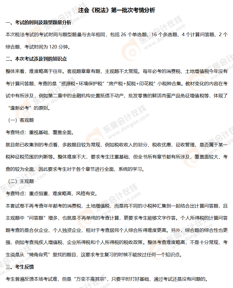 cpa稅法試題內(nèi)容第一批次!cpa考試公告已經(jīng)發(fā)布,此時正是考試階段,cpa稅法考試已經(jīng)結(jié)束,考生最為關(guān)注的就是有關(guān)稅法試題的相關(guān)內(nèi)容,接下來就由東奧會計在線為各位考生們進行一下詳細(xì)的整理和歸納,考生可以將此頁面進行保存查看。