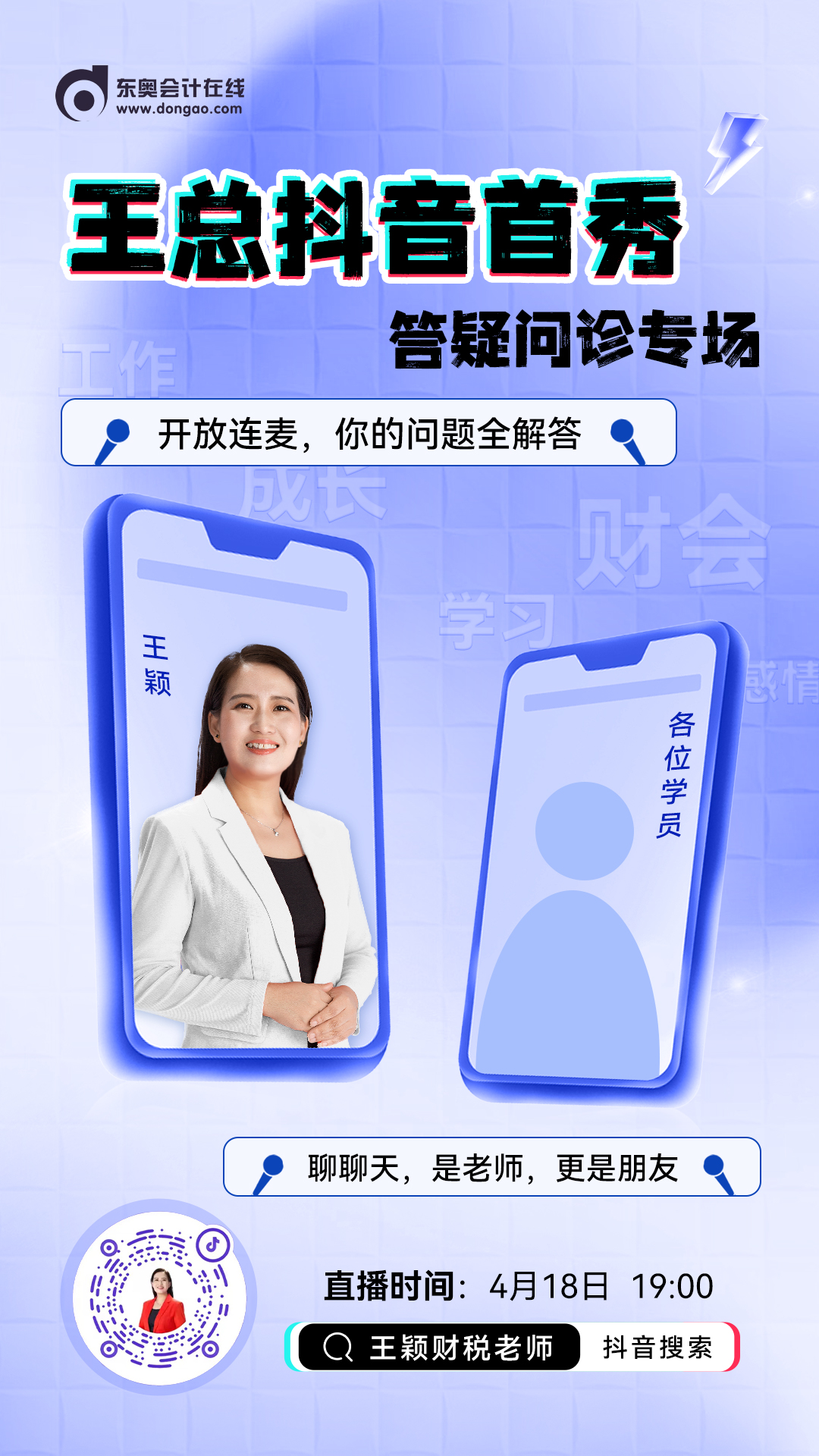 2023年注會考試報名入口現(xiàn)已開通,備考學(xué)習(xí)正在進行中!無論是報考階段還是備考階段,都是各類問題的高發(fā)期!對此,東奧王穎老師開啟抖音首秀,直播答疑問診,與考生在線連麥,解決考生所有問題!打算報考的、正在備考的、準(zhǔn)備跨考的的朋友們,在學(xué)習(xí)上、生活上、工作上遇到的各類問題,都可以在抖音連線和老師聊一聊!直播詳細信息如下,快來連麥吧!