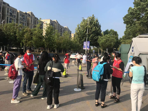 (護(hù)考志愿者在南京江寧高等職業(yè)技術(shù)學(xué)校服務(wù)考生)