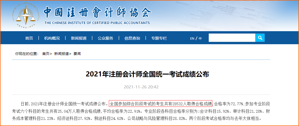 在中國注冊會計師協(xié)會發(fā)布的《2021年注冊會計師全國統(tǒng)一考試成績公布》中,公布了2021年注冊會計師綜合階段合格人數(shù),共有28532人取得合格成績。