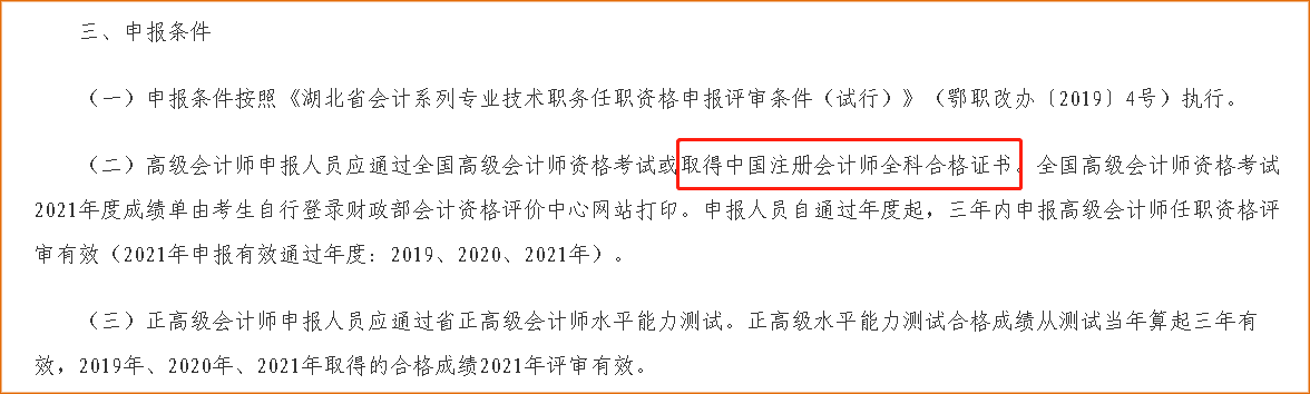 的確如此,湖北注冊會計師可直接申請參加高級會計師評審!湖北省財政廳發(fā)布的《關(guān)于報送2021年度湖北省高級、正高級會計師專業(yè)技術(shù)職務(wù)評審申報材料的通知》中標明:高級會計師申報人員應(yīng)通過全國高級會計師資格考試或取得中國注冊會計師全科合格證書。這也就是說明,符合條件的湖北注冊會計師可免試高會,直接申請參加高級會計師評審。