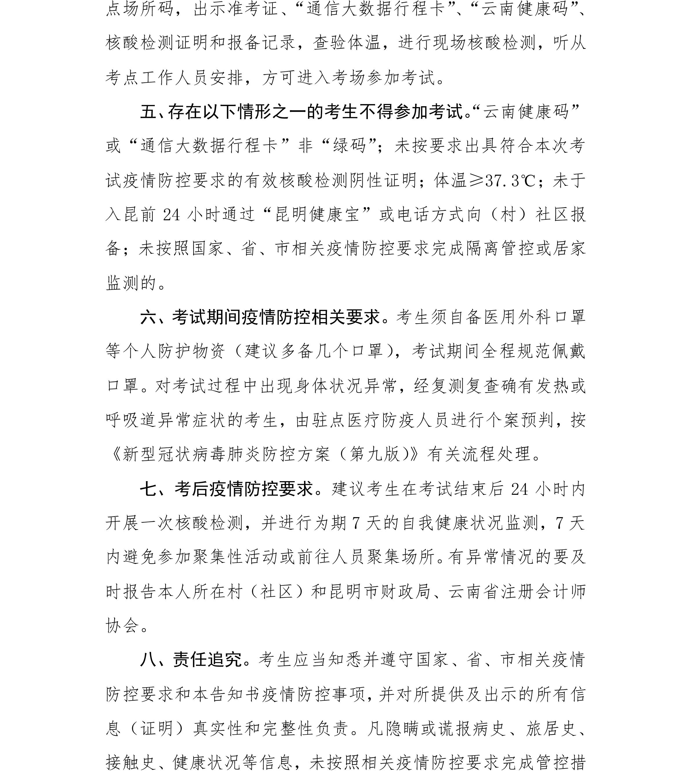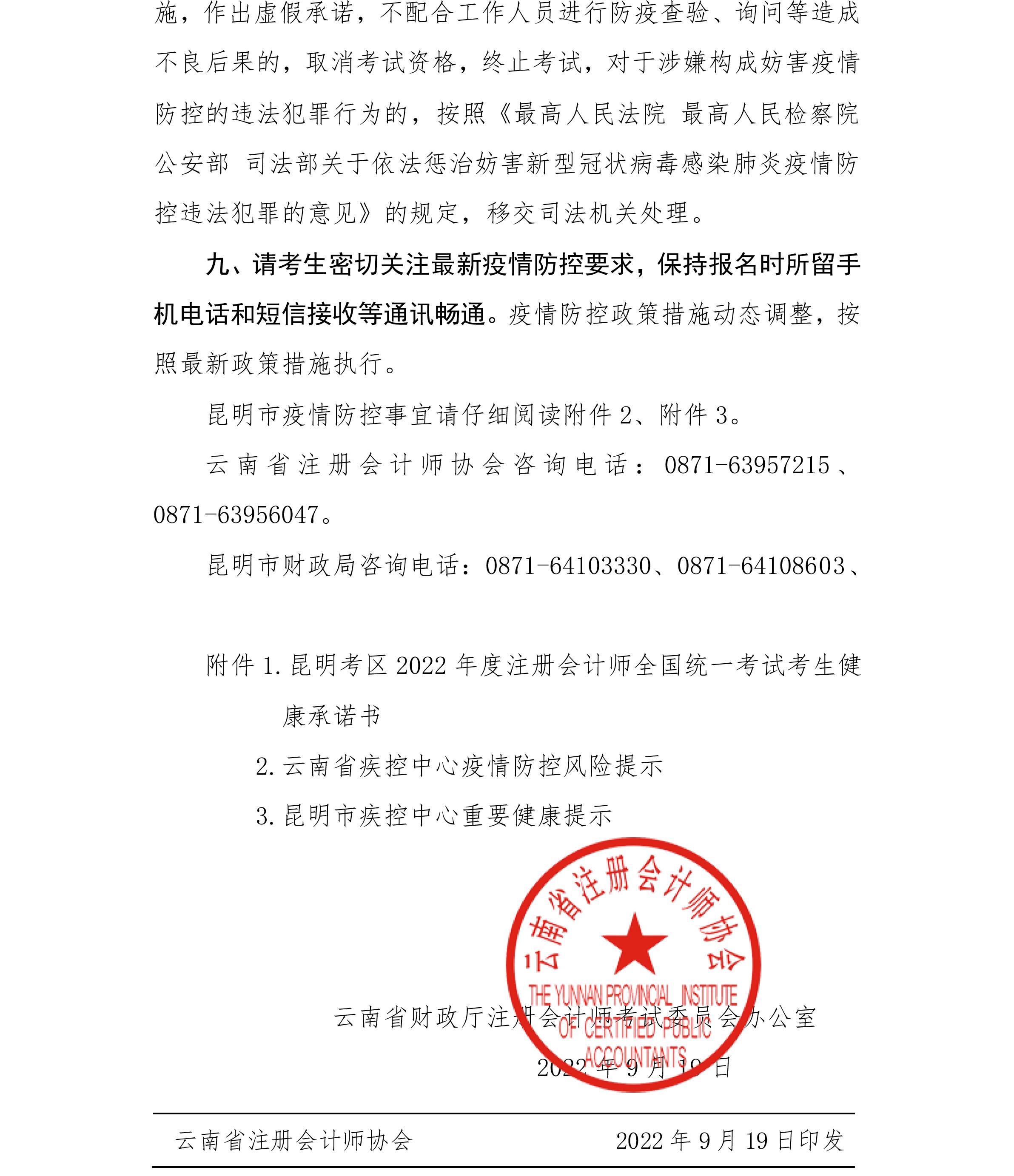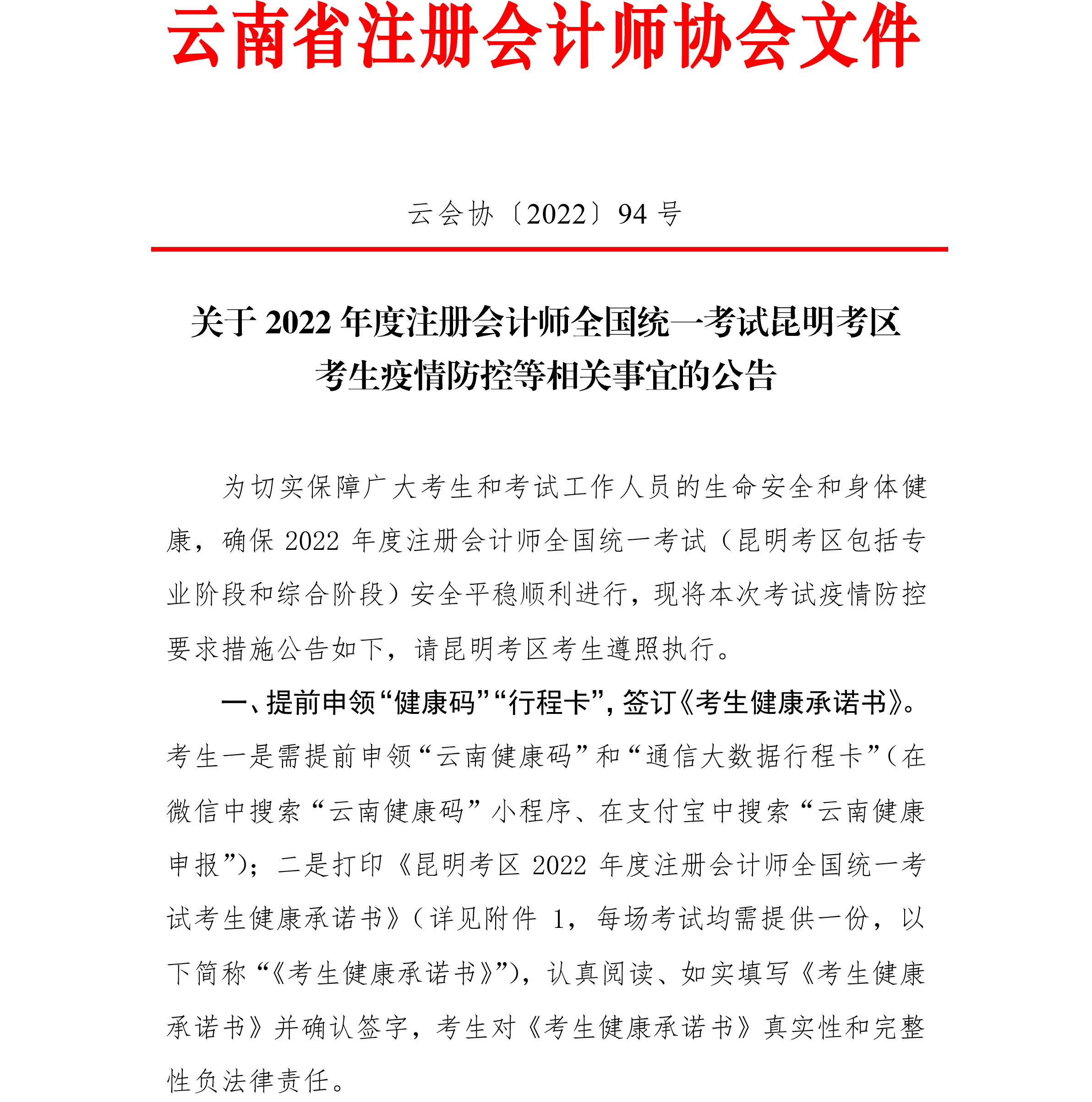 關于2022年度注會考試云南昆明考區(qū)考生疫情防控等相關事宜的公告