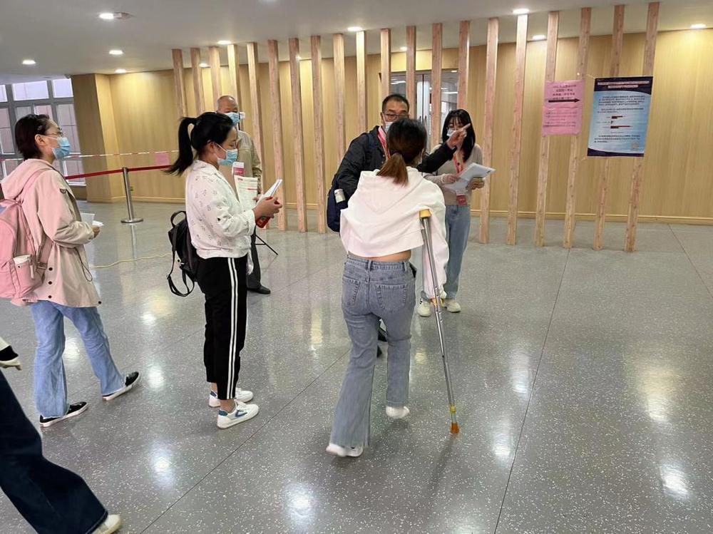 培華學(xué)院考點,23日一大早,一個拄著拐杖的考生出現(xiàn)在巡考工作人員的視線中。由于考試時間臨近,考生行動極為不便,在上前詢問考生的情況后,巡考工作人員立即幫忙并引導(dǎo)該名考生進入考場。