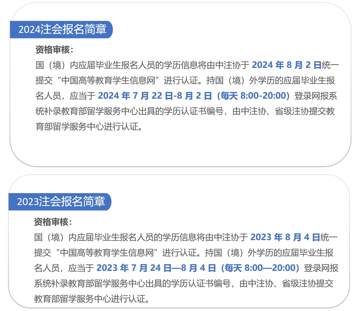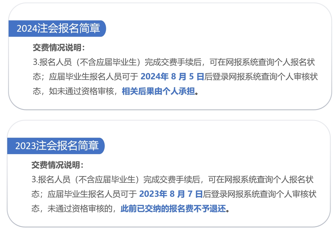 2024年注會(huì)報(bào)名簡(jiǎn)章中所涉時(shí)間是年前考試公告的再次確定和細(xì)化,我們通過與2023年的對(duì)比,可以清晰地看出考試安排有無重大調(diào)整。