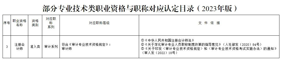 黑龍江省人力資源和社會(huì)保障廳發(fā)布的《關(guān)于規(guī)范部分專業(yè)技術(shù)類職業(yè)資格與職稱對(duì)應(yīng)認(rèn)定關(guān)系有關(guān)事宜的通知》明確規(guī)定,注冊(cè)會(huì)計(jì)師對(duì)應(yīng)職稱層級(jí)為審計(jì)師?。以下是黑龍江部分專業(yè)技術(shù)類職業(yè)資格與職稱對(duì)應(yīng)認(rèn)定目錄(2023年版)。