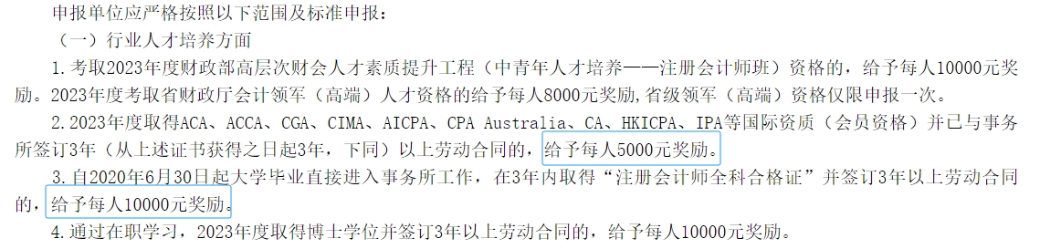 近日,江蘇省注冊會計師協(xié)會發(fā)布了《關(guān)于組織申報2024年江蘇省注冊會計師行業(yè)人才專項(xiàng)資金獎補(bǔ)項(xiàng)目的通知》,通過注會考試并符合條件的人員可以申報領(lǐng)取最高10000元的獎勵資金。