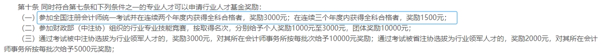專(zhuān)職在本省會(huì)計(jì)師事務(wù)所從業(yè)滿(mǎn)3年,參加注冊(cè)會(huì)計(jì)師全國(guó)統(tǒng)一考試并在連續(xù)兩個(gè)年度內(nèi)獲得全科合格者,獎(jiǎng)勵(lì)3000元;在連續(xù)三個(gè)年度內(nèi)獲得全科合格者,獎(jiǎng)勵(lì)1500元?。