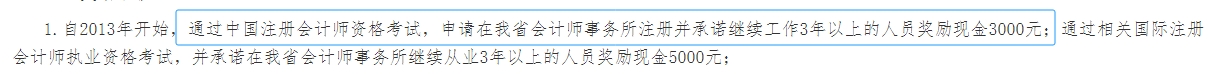 根據(jù)河南省注冊會計師協(xié)會發(fā)布的《關(guān)于申報“行業(yè)人才培養(yǎng)專項(xiàng)資金”獎勵申請的通知》可知,通過中國注冊會計師資格考試,申請在我省會計師事務(wù)所注冊并承諾繼續(xù)工作3年以上的人員獎勵現(xiàn)金3000元。