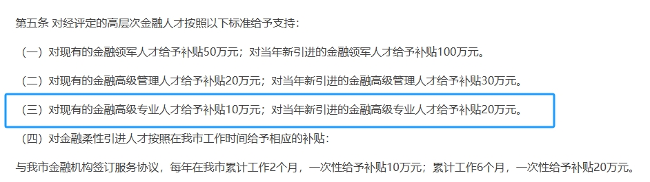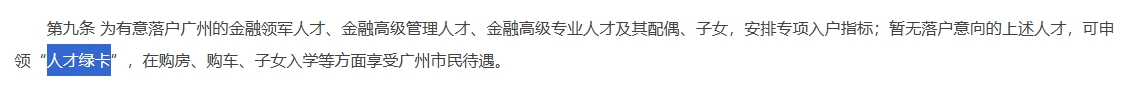根據(jù)廣州市地方金融監(jiān)督管理局關(guān)于印發(fā)的《廣州高層次金融人才支持項(xiàng)目實(shí)施辦法(第二次修訂)》可知,對(duì)現(xiàn)有的金融高級(jí)專業(yè)人才給予補(bǔ)貼10萬(wàn)元;對(duì)當(dāng)年新引進(jìn)的金融高級(jí)專業(yè)人才給予補(bǔ)貼20萬(wàn)元。其配偶、子女,安排專項(xiàng)入戶指標(biāo);暫無(wú)落戶意向的上述人才,可申領(lǐng)“人才綠卡”,在購(gòu)房、購(gòu)車、子女入學(xué)等方面享受廣州市民待遇。