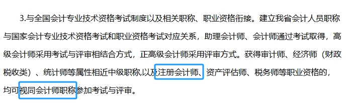 廣東省人力資源和社會(huì)保障廳、廣東省財(cái)政廳關(guān)于印發(fā)的《廣東省深化會(huì)計(jì)人員職稱制度改革實(shí)施方案》中寫(xiě)到,為促進(jìn)職稱制度與職業(yè)資格、人才培養(yǎng)使用相銜接,具有注冊(cè)會(huì)計(jì)師職業(yè)資格的,視同會(huì)計(jì)師職稱參加考試和評(píng)審。