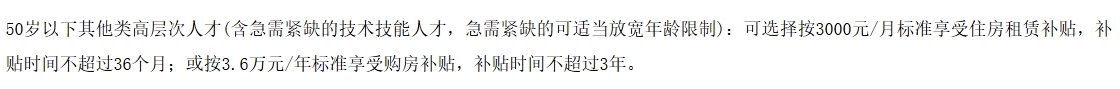 根據(jù)中共海南省委辦公廳、海南省人民政府辦公廳印發(fā)的《海南省關于引進人才住房保障的指導意見》的通知規(guī)定,50歲以下其他類高層次人才(含急需緊缺的技術技能人才,急需緊缺的可適當放寬年齡限制):可選擇按3000元/月標準享受住房租賃補貼,補貼時間不超過36個月;或按3.6萬元/年標準享受購房補貼,補貼時間不超過3年。