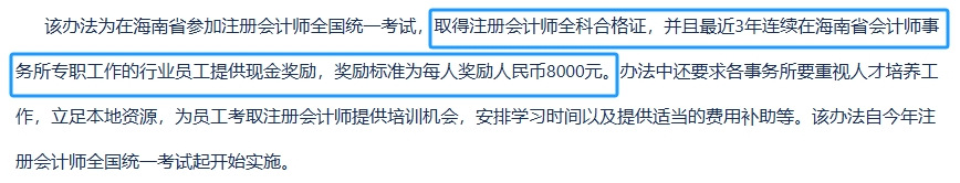 《海南省注冊會計師行業(yè)關于鼓勵從業(yè)人員考取注冊會計師資格的獎勵暫行辦法》規(guī)定,在海南省參加注冊會計師全國統(tǒng)一考試,取得注冊會計師全科合格證,并且最近3年連續(xù)在海南省會計師事務所專職工作的行業(yè)員工提供現(xiàn)金獎勵,獎勵標準為每人獎勵人民幣8000元。