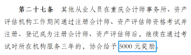 重慶市注冊(cè)會(huì)計(jì)師協(xié)會(huì)發(fā)布的《重慶市注冊(cè)會(huì)計(jì)師行業(yè)、資產(chǎn)評(píng)估行業(yè)人才培養(yǎng)辦法》規(guī)定,在重慶會(huì)計(jì)師事務(wù)所、資產(chǎn)評(píng)估機(jī)構(gòu)工作期間通過注冊(cè)會(huì)計(jì)師考試并注冊(cè)、登記成為注冊(cè)會(huì)計(jì)師的人員,繼續(xù)在通過考試時(shí)所在機(jī)構(gòu)服務(wù)三年的,協(xié)會(huì)給予5000元獎(jiǎng)勵(lì)。