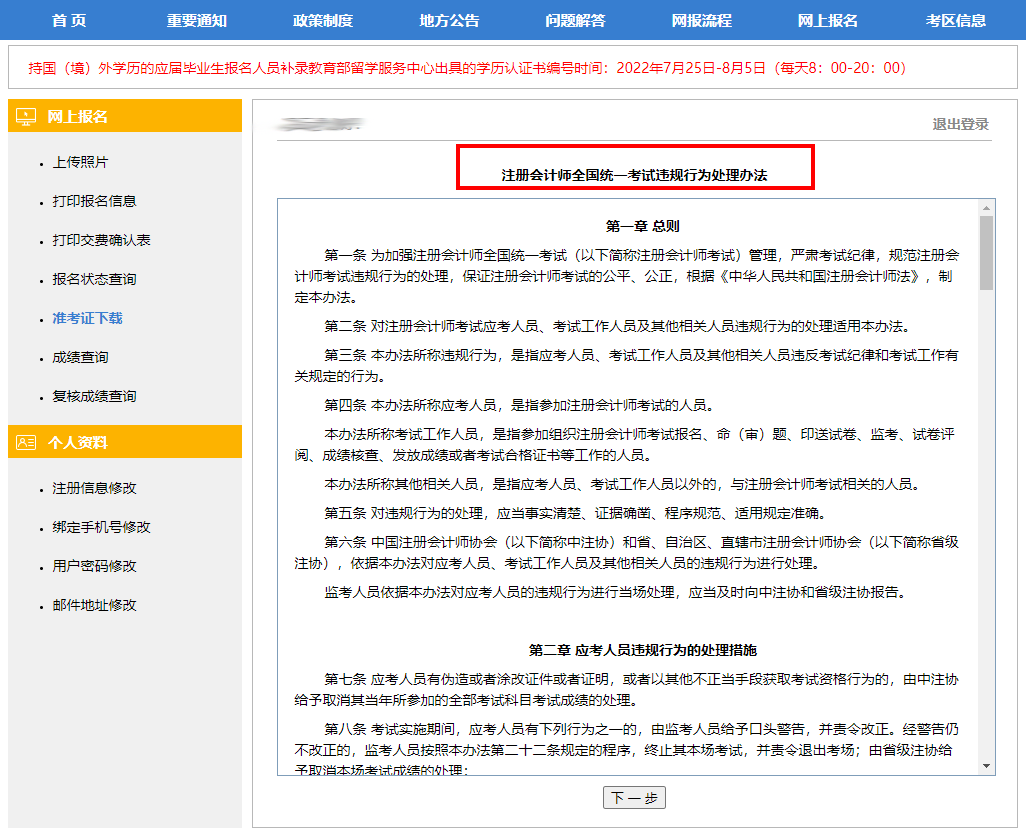 閱讀《注冊會計(jì)師全國統(tǒng)一考試違規(guī)行為處理辦法》,在仔細(xì)看過后點(diǎn)擊“下一步”;
