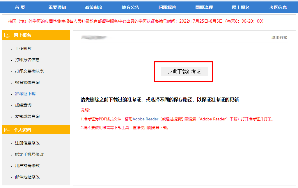 點(diǎn)擊“準(zhǔn)考證打印”