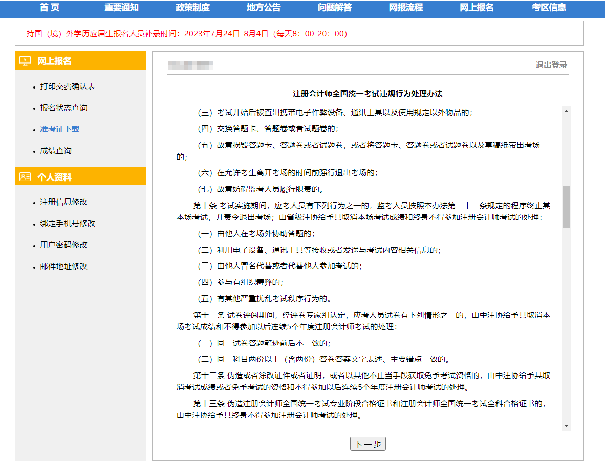 第三步:閱讀《注冊(cè)會(huì)計(jì)師全國(guó)統(tǒng)一考試違規(guī)行為處理辦法》,在仔細(xì)看過(guò)后點(diǎn)擊“下一步”;