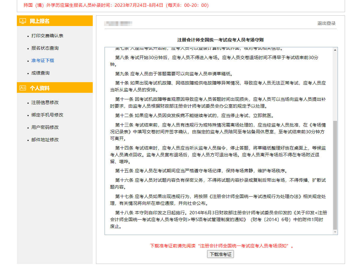 第四步:閱讀《注冊(cè)會(huì)計(jì)師全國(guó)統(tǒng)一考試應(yīng)考人員考場(chǎng)守則》,點(diǎn)擊“下載準(zhǔn)考證”按鈕;