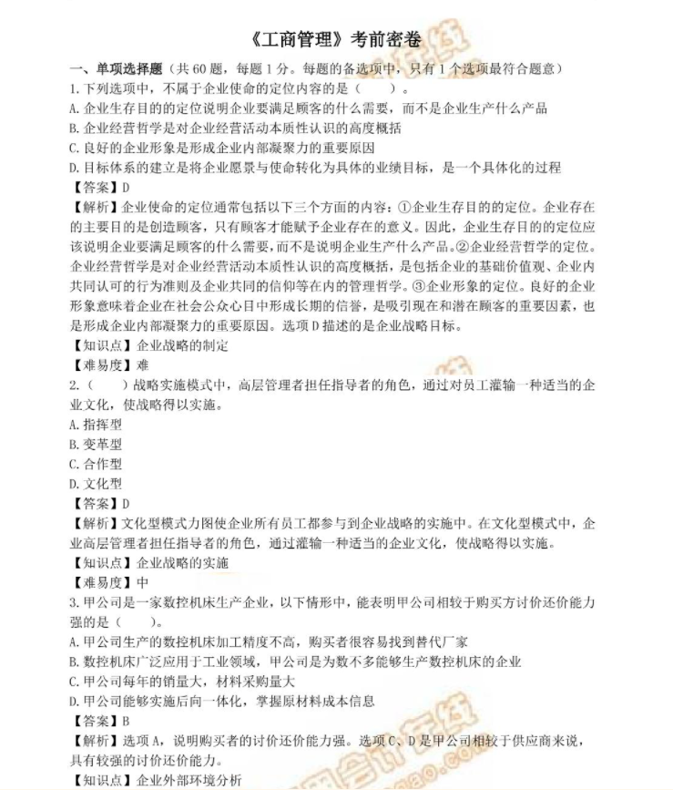 2025年中級經(jīng)濟師《工商管理》考前模擬試卷,涵蓋企業(yè)戰(zhàn)略、市場營銷、生產(chǎn)管理、人力資源規(guī)劃等核心章節(jié),題型包括單選、多選及案例分析,旨在全面檢驗考生對專業(yè)知識的掌握與應(yīng)用能力,助力考生高效備考,備考進度過半的同學們快來試試這套模擬試卷吧,建議同學們嚴格按照單科90分鐘進行作答。