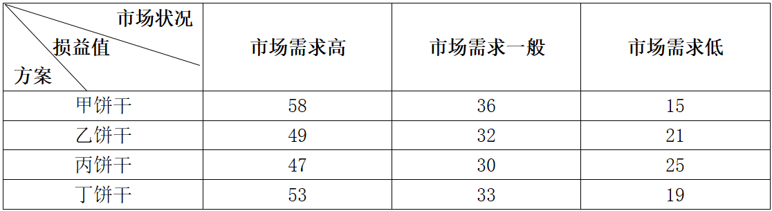 1.某大型餅干生產(chǎn)企業(yè)采用密集型成長戰(zhàn)略,不斷挖掘和提升自身競爭優(yōu)勢,獲得快速發(fā)展。該企業(yè)采用7S模型分析其戰(zhàn)略過程,統(tǒng)籌各種資源和要素。有力保障了企業(yè)戰(zhàn)略措施順利實施。為了開發(fā)中老年餅干市場,該企業(yè)采用定性決策和定量決策相結(jié)合的方法進(jìn)行健胃餅干的新產(chǎn)品經(jīng)營決策。該企業(yè)共有甲餅干、乙餅干、丙餅干、丁餅干四種產(chǎn)品方案可供選擇。每種餅干產(chǎn)品均存在著市場需求高、市場需求一般、市場需求低三種市場狀態(tài)。對應(yīng)的市場狀況及損益值(單位:百萬元)如下表所示: