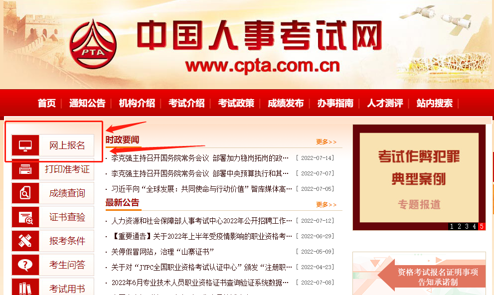 中級(jí)經(jīng)濟(jì)師考試從中國(guó)人事考試網(wǎng)報(bào)名,報(bào)名入口是全國(guó)統(tǒng)一的,進(jìn)入中國(guó)人事考試網(wǎng)官網(wǎng)(http://www.cpta.com.cn/)我們即可看到左側(cè)“網(wǎng)上報(bào)名”字樣,如圖:
