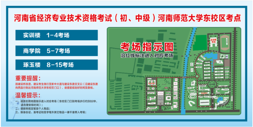 河南考區(qū)2022年中級經(jīng)濟師補考的同學(xué)們請注意,河南人事考試中心發(fā)布了“河南新鄉(xiāng)市河南師范大學(xué)(東校區(qū))考點考生友情提示”,其中說明“因建設(shè)路與牧野路交叉口建設(shè)橋正在施工中,道路不通”等重要的路況信息,,并提示大家提前到達考場,具體如下。