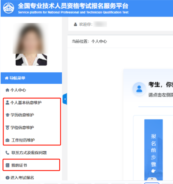 變化三:報名界面左側導航菜單欄,新增“個人基本信息維護、學歷信息維護、學位信息維護、工作經(jīng)歷維護、我的證書”選項。