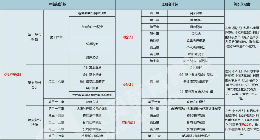 中級(jí)經(jīng)濟(jì)師與CPA的重疊相對(duì)比較高,例如經(jīng)濟(jì)基礎(chǔ)知識(shí)與注會(huì)的稅法知識(shí)點(diǎn),財(cái)政稅收與稅法的知識(shí)點(diǎn)都有較高的重疊度,同時(shí)備考效率更高。下面請(qǐng)參考由東奧會(huì)計(jì)在線老師整理的關(guān)于“中級(jí)經(jīng)濟(jì)師與CPA知識(shí)點(diǎn)重合度”的對(duì)比表格,點(diǎn)擊可查看大圖: