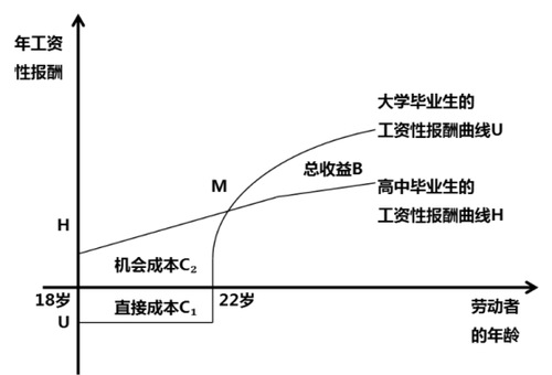 B部分的面積大于C1+C2部分的面積,則一個人上大學就是值得的,否則,從經(jīng)濟角度來說,就是沒有意義的 |