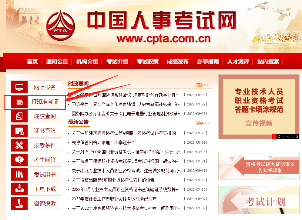2022年中級經(jīng)濟(jì)師考試補考打印準(zhǔn)考證首先登錄官網(wǎng)。進(jìn)入中國人事考試網(wǎng)(http://www.cpta.com.cn/)。