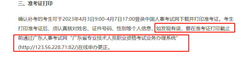 3.考生打印準(zhǔn)考證后,須認(rèn)真核對姓名、證件號碼、性別等個人信息,如發(fā)現(xiàn)有誤請及時聯(lián)系所在考區(qū)的人事考試機構(gòu)或部分地區(qū)明確標(biāo)明可在官網(wǎng)辦理信息有誤的問題,例如廣東: