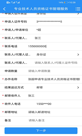 5.填寫(xiě)收件人姓名、電話和郵寄地址后,點(diǎn)擊“下一步”(結(jié)果送達(dá)方式請(qǐng)選擇郵寄,備注中請(qǐng)注明領(lǐng)取何種專(zhuān)業(yè)技術(shù)資格證書(shū)。)