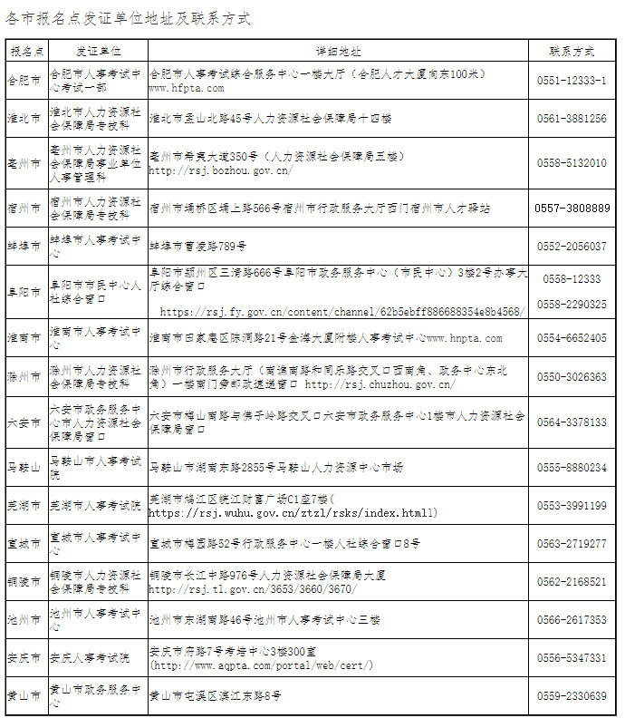 附:各市報名點發(fā)證單位地址及聯(lián)系方式