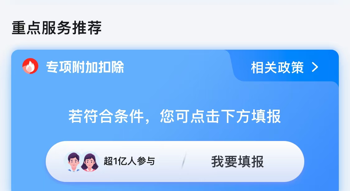 登錄APP后,在首頁(yè)找到 “專(zhuān)項(xiàng)附加扣除填報(bào)” 入口,點(diǎn)擊進(jìn)入。