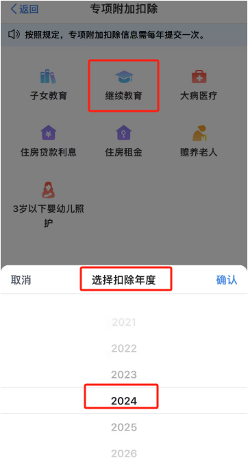 進(jìn)入專(zhuān)項(xiàng)附加扣除填報(bào)頁(yè)面后,從中選擇“繼續(xù)教育”選項(xiàng),隨后系統(tǒng)會(huì)彈出相關(guān)提示框,提示需要確認(rèn)一些基本的申報(bào)信息,比如扣除年度,此時(shí)應(yīng)選擇“2024”年,確認(rèn)無(wú)誤后點(diǎn)擊下一步,進(jìn)入繼續(xù)教育專(zhuān)項(xiàng)信息填寫(xiě)的詳細(xì)頁(yè)面。