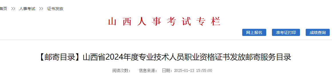 根據山西人事考試專欄發(fā)布“山西省2024年度專業(yè)技術人員職業(yè)資格證書發(fā)放郵寄服務目錄”消息我們得知:山西2024年中級經濟師郵寄證書自1月13日起,請同學們進入官網查看消息詳情,具體內容如下。