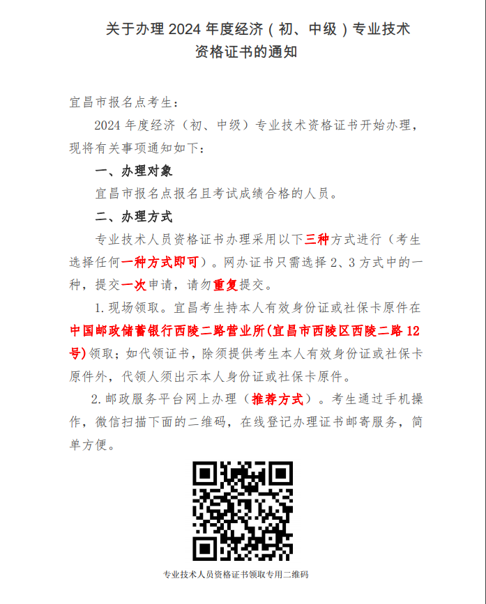 湖北宜昌2024年中級經(jīng)濟(jì)師證書辦理通知