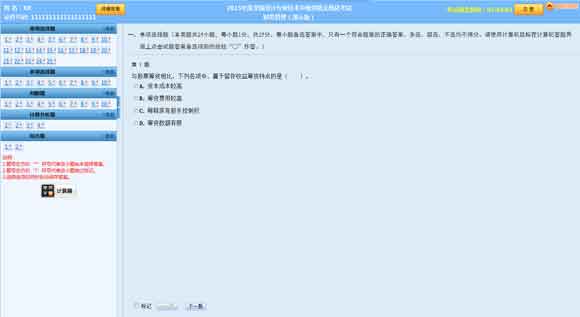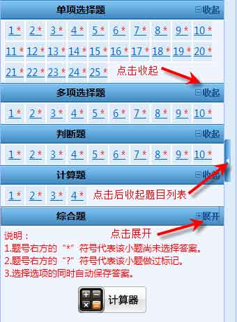 1. 根據(jù)考試科目不同,題目類型分為單項選擇題、多項選擇題、判斷題、計算分析題、簡答題和綜合題。題號右方的"*"號表示該小題還未作答,"?"號表示該小題做過標(biāo)記?忌梢酝ㄟ^題號列表查看本考試科目全套試卷的作答情況(包括每道試題的已答或未答狀態(tài)、標(biāo)記狀態(tài)),還可點(diǎn)擊各題號按鈕,直接進(jìn)入各試題進(jìn)行答題或檢查。