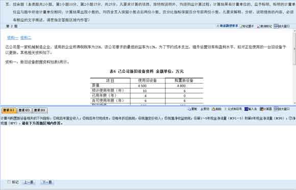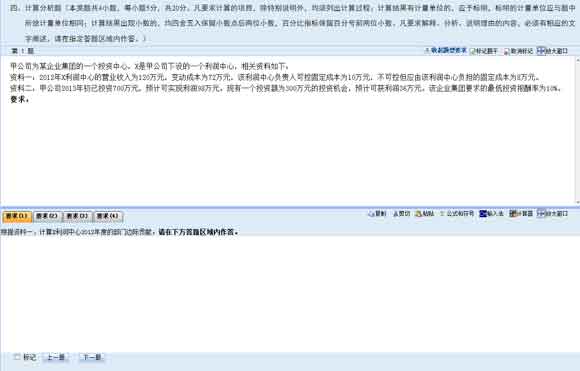 。1)計算分析題、簡答題、綜合題都是上下分欄,上欄為資料(題干)區(qū),下欄為答題區(qū)?忌筛鶕(jù)需要上下拖動分欄條,調(diào)整資料區(qū)或答題區(qū)的可視區(qū)域。答題區(qū)根據(jù)考試題目要求分為"要求(1)"、"要求(2)"、"要求(3)"等多項標(biāo)簽頁?忌凑找笤诟髯源痤}區(qū)域內(nèi)進(jìn)行答題。