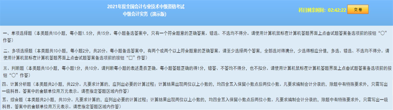 全國會計資格評價網(wǎng)發(fā)布了“全國會計專業(yè)技術(shù)資格無紙化考試操作說明、答題演示、模擬答題系統(tǒng)”,小編點擊進入發(fā)現(xiàn),2021年中級會計職稱考試題量和評分標準有一定的變化,特為大家進行了整理!擔心錯題沒人講?2022中級會計暢聽好課再升級>>>