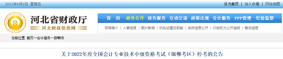 關(guān)于2022年度全國(guó)會(huì)計(jì)專(zhuān)業(yè)技術(shù)中級(jí)資格考試(邯鄲考區(qū))停考的公告