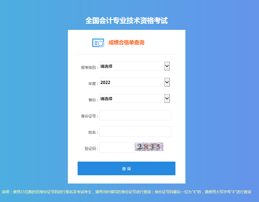 第四步:按要求分別輸入“報考級別”、“年度”、“省份”、“身份證號”、“姓名”和“驗證碼”后,點擊“查詢”。