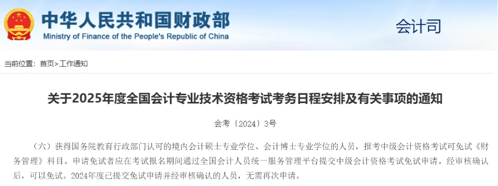 財(cái)政部發(fā)布《關(guān)于2025年度全國會計(jì)專業(yè)技術(shù)資格考試考務(wù)日程安排及有關(guān)事項(xiàng)的通知》,明確“獲得國務(wù)院教育行政部門認(rèn)可的境內(nèi)會計(jì)碩士專業(yè)學(xué)位、會計(jì)博士專業(yè)學(xué)位的人員,報(bào)考中級會計(jì)資格考試可免試《財(cái)務(wù)管理》科目。