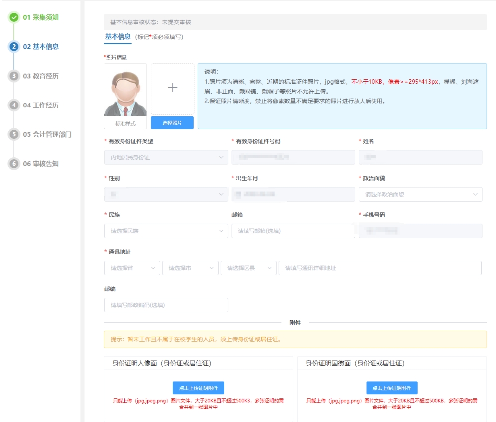基本信息采集須知頁(yè)點(diǎn)擊下一步進(jìn)入到基本信息頁(yè)。在基本信息頁(yè)中需要上傳清晰、完整、近期的標(biāo)準(zhǔn)證件照片,并且要求不小于 10KB,像素>=295*413px,請(qǐng)仔細(xì)閱讀上傳照片框右側(cè)的說(shuō)明?;拘畔⒅杏行矸葑C件類(lèi)型、有效身份證件號(hào)碼、姓名、性別、出生年月以及手機(jī)號(hào)碼為注冊(cè)時(shí)所填信息,基本信息頁(yè)不可修改。在填寫(xiě)完整基本信息后點(diǎn)擊下一步,進(jìn)入到教育經(jīng)歷頁(yè)。