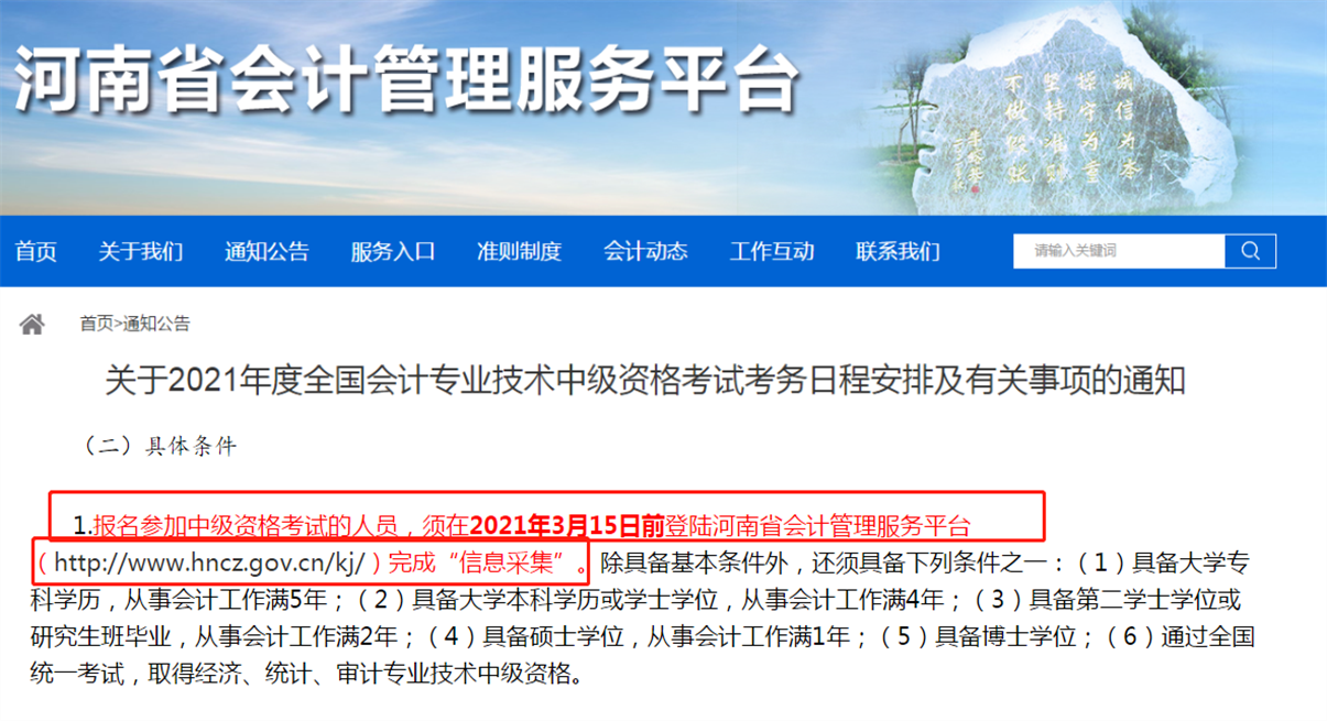 河南省2021年中級會計報名條件中明確要求:報名參加中級資格考試的人員,須在2021年3月15日前登陸河南省會計管理服務(wù)平臺(http://www.hncz.gov.cn/kj/)完成“信息采集”。