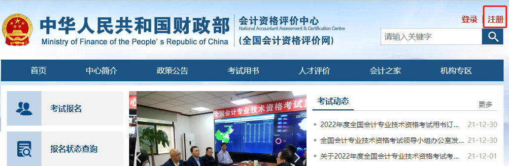 第一步:打開“全國(guó)會(huì)計(jì)資格評(píng)價(jià)網(wǎng)”點(diǎn)擊右上角“注冊(cè)”