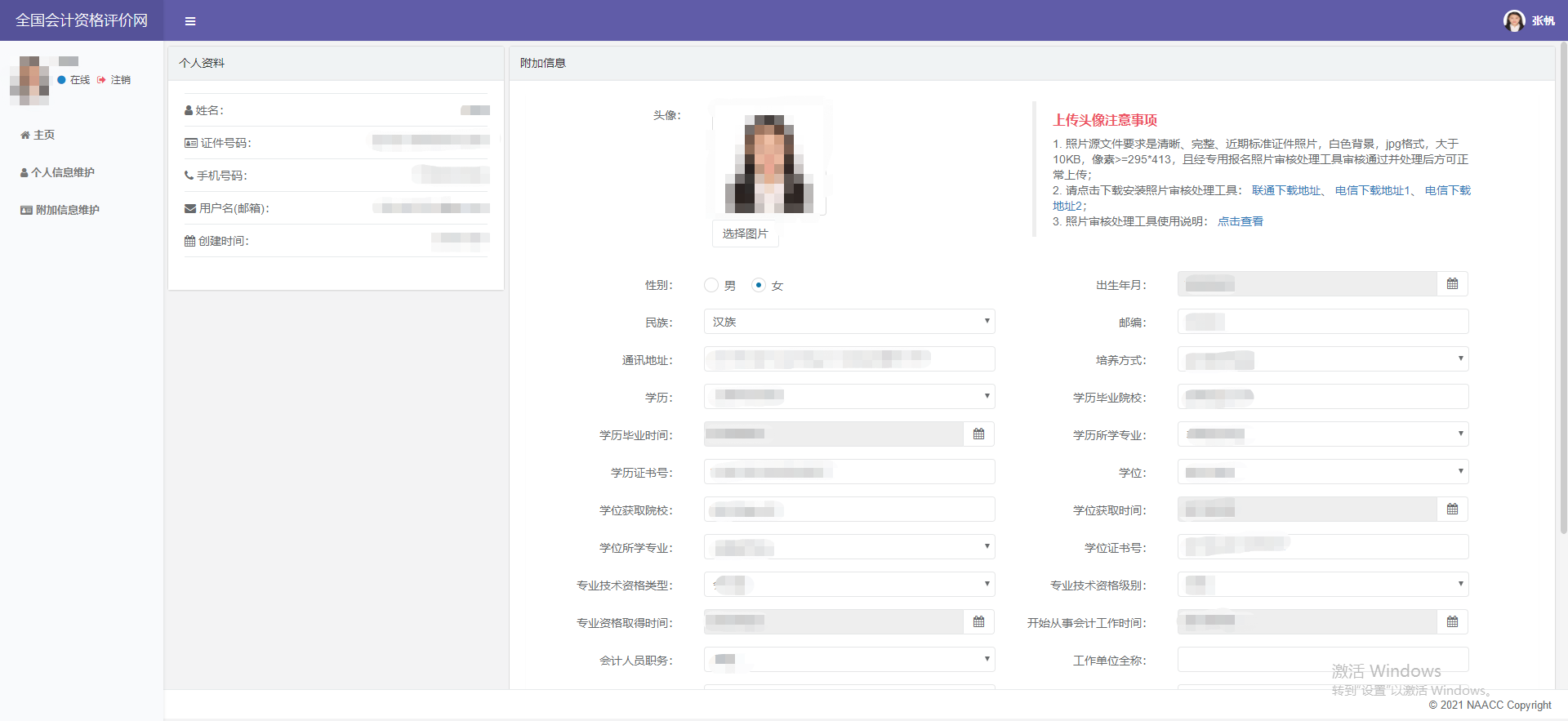成功登錄系統(tǒng)后,進(jìn)入個(gè)人主頁(yè)。鼠標(biāo)移動(dòng)到頁(yè)面右上角的頭像,顯示下拉菜單,點(diǎn)擊菜單,可進(jìn)行相應(yīng)的操作。點(diǎn)擊附加信息維護(hù),即可提前填寫報(bào)名相關(guān)信息以及照片等!
