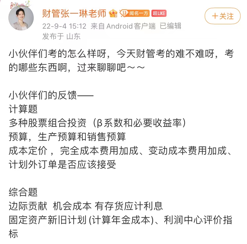 東奧張一琳老師根據(jù)考生們的反饋,整理了財(cái)務(wù)管理第一批次的部分考試內(nèi)容!今年財(cái)務(wù)管理第二批次的考試考察了多種股票組合投資、成本定價(jià)等知識(shí)點(diǎn),還未參加中級(jí)會(huì)計(jì)考試的同學(xué)可以根據(jù)此內(nèi)容抓緊時(shí)間把重點(diǎn)知識(shí)再看一遍吧!