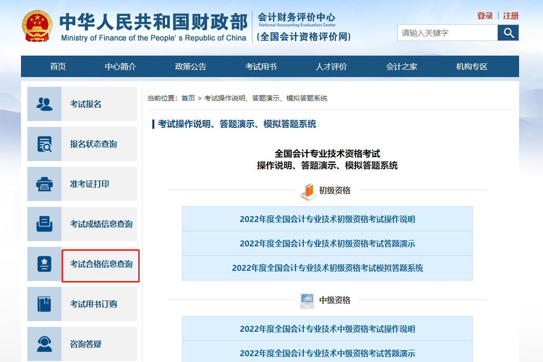 第一步:輸入網(wǎng)址,登錄“全國會(huì)計(jì)資格評(píng)價(jià)網(wǎng)”(http://kzp.mof.gov.cn/moni.jsp),點(diǎn)擊頁面左側(cè)【考試合格信息查詢】,進(jìn)入查詢界面;