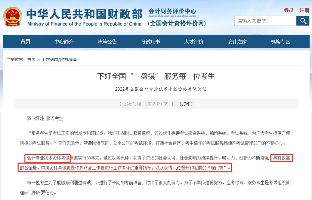 財(cái)政部在2022年發(fā)布的《下好全國(guó)“一盤棋” 服務(wù)每一位考生——2022年全國(guó)會(huì)計(jì)專業(yè)技術(shù)中級(jí)資格考試側(cè)記》文章中明確指出:會(huì)計(jì)專業(yè)技術(shù)資格具有很高的含金量,中級(jí)資格考試更是獲得職位晉升和發(fā)展的“敲門磚”!